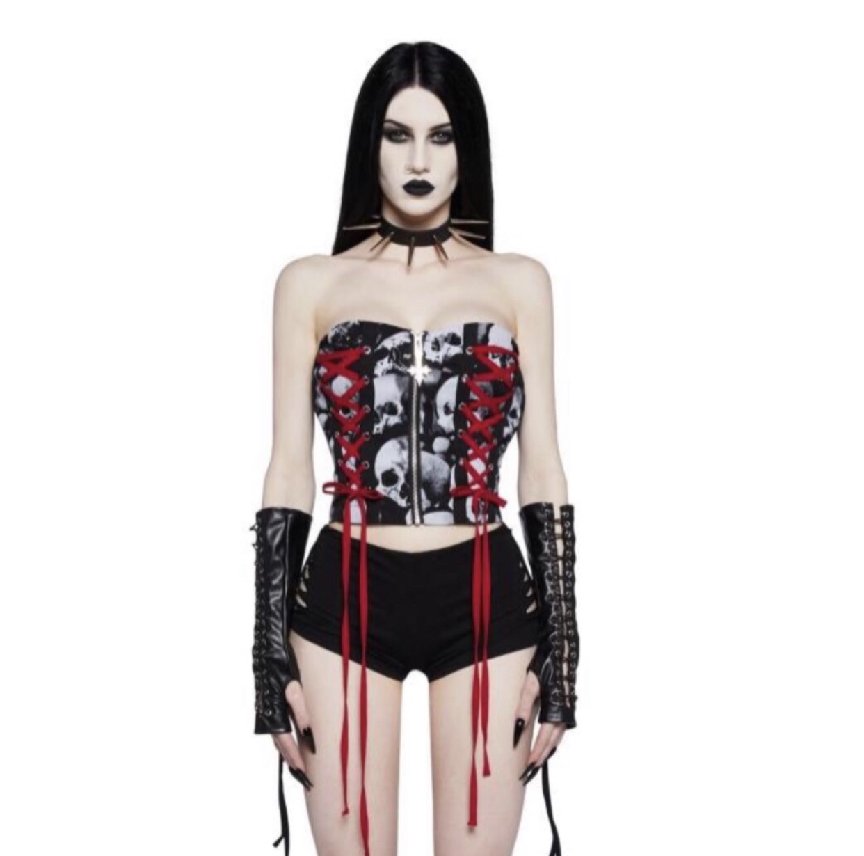 This striking piece features a bold skull motif intertwined with intricate red lace detailing, set against a sleek black backdrop. The corset is designed to accentuate your silhouette, offering both style and comfort. Perfect for gothic enthusiasts and those seeking a unique statement piece, this corset combines alternative fashion with timeless allure. Whether worn for a special occasion or as part of your everyday attire, it promises to turn heads and showcase your individual style.